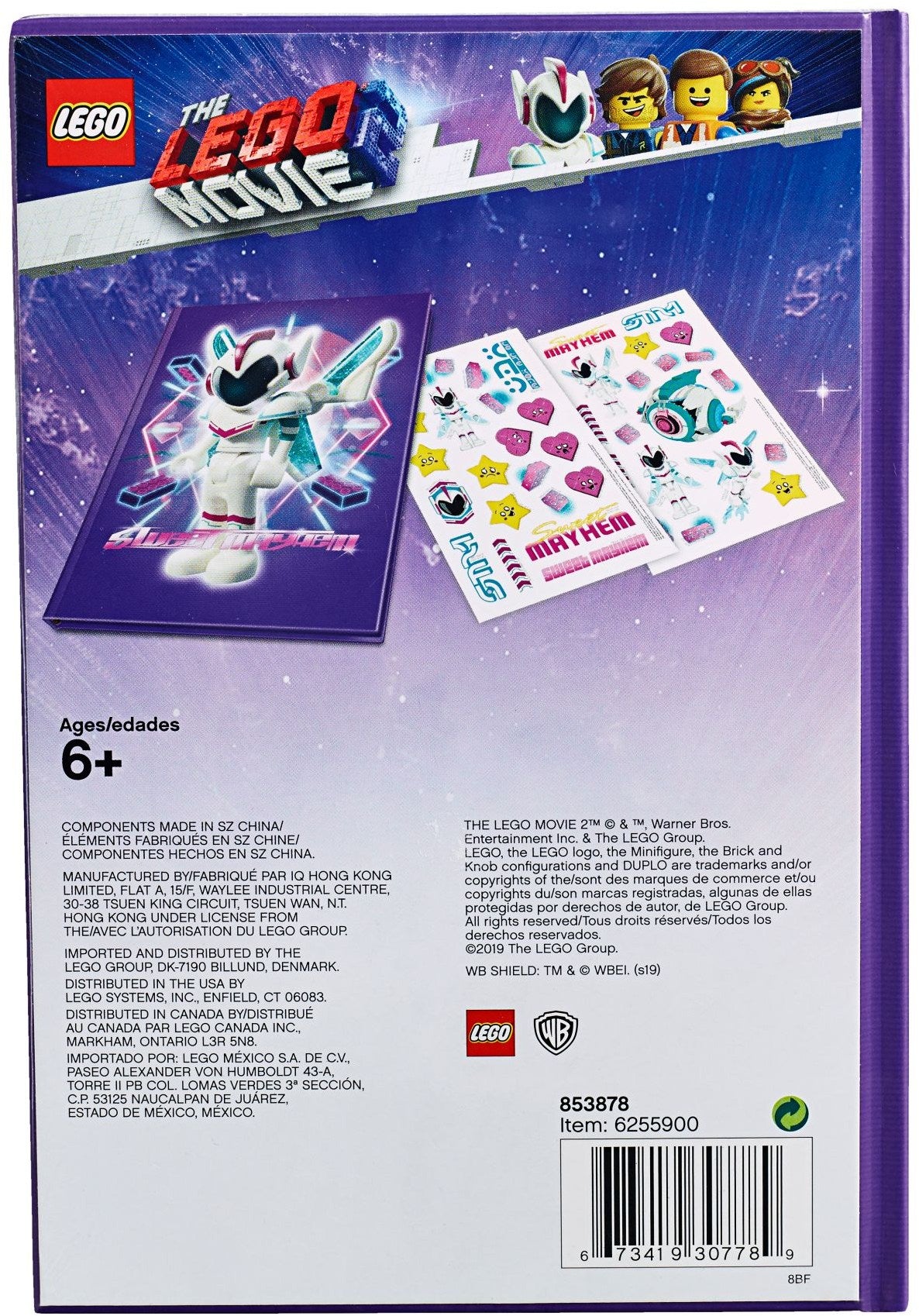 Make notes in THE LEGO® MOVIE 2™ 853878 Notebook, featuring a cool Sweet Mayhem artwork on the front cover and 128 medium-ruled pages with a LEGO brick detail on each page, plus 2 sheets of decorative stickers with images of THE LEGO MOVIE 2 villain Sweet Mayhem, Star, Heart and more.