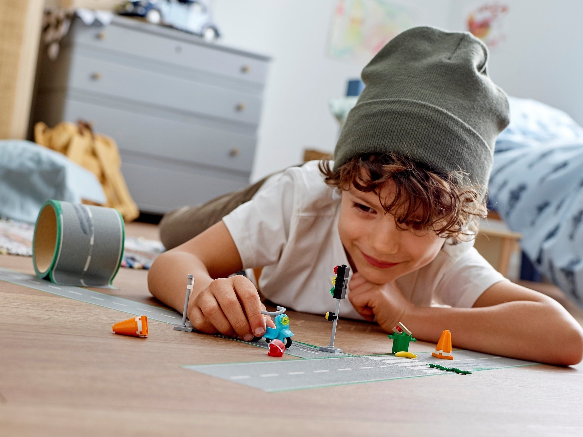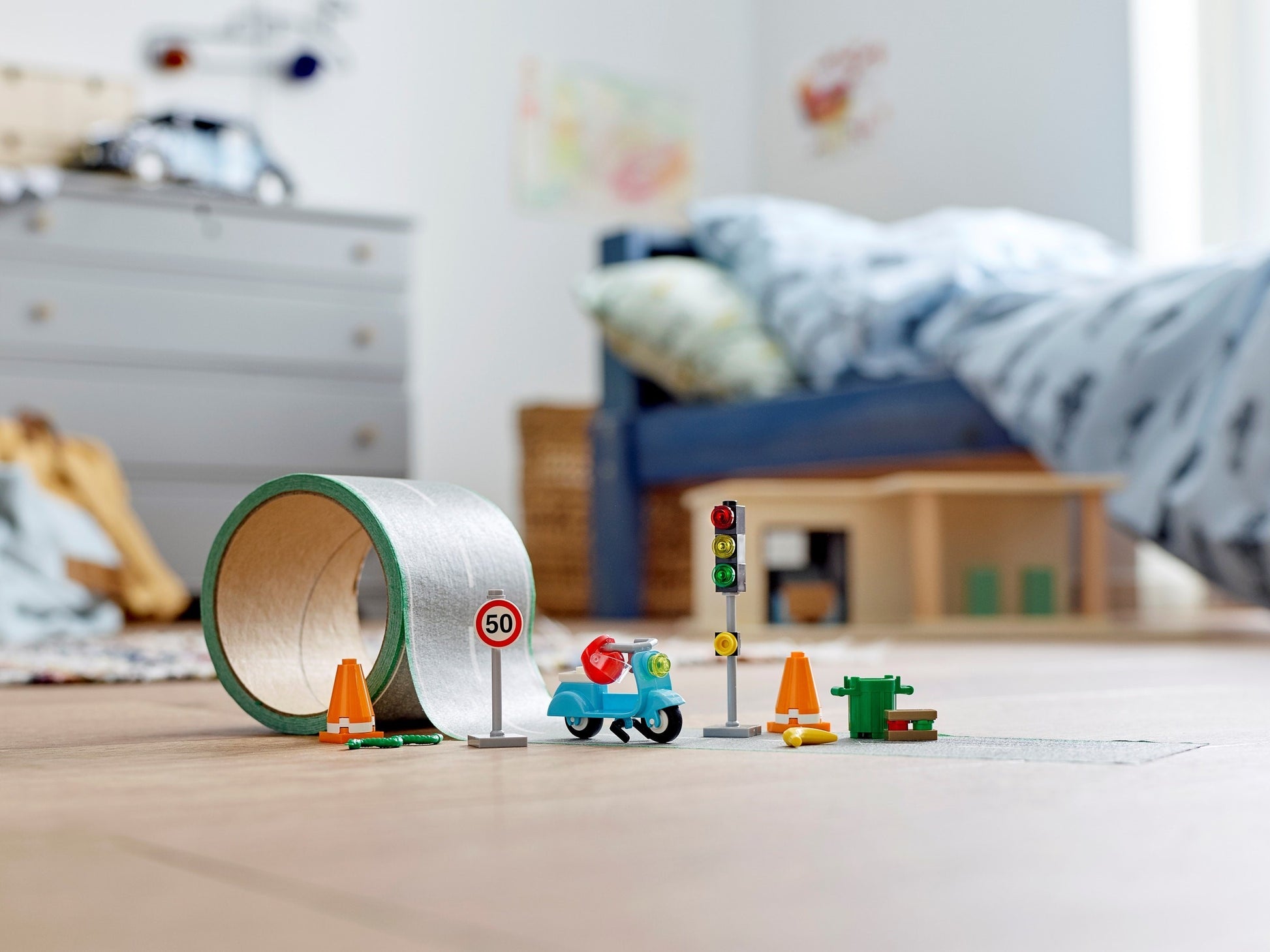 LEGO® fans will be thrilled to stage exciting action and races with this cool Road Tape accessory set (854048). Roll out the grey tape featuring road markings, tire skid marks and grass effects, and kids can create fun stories with it and 8 elements, which include a speed sign, traffic cones, traffic light and moped. The set can be combined with other LEGO® sets, so kids can race all their vehicles along the tape.