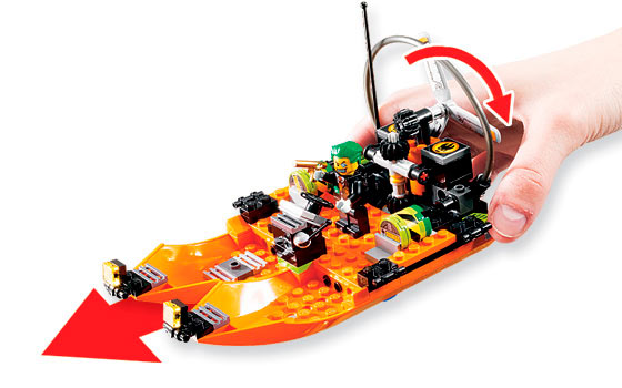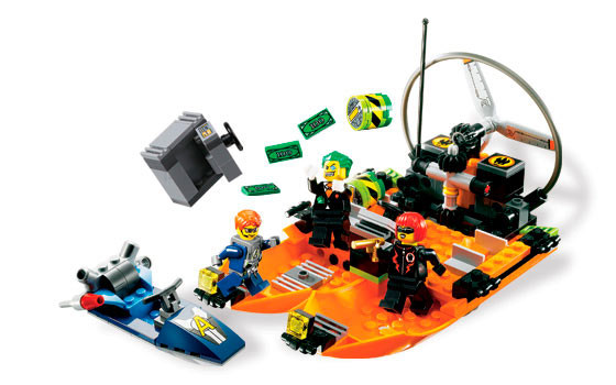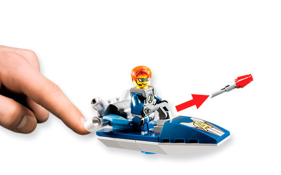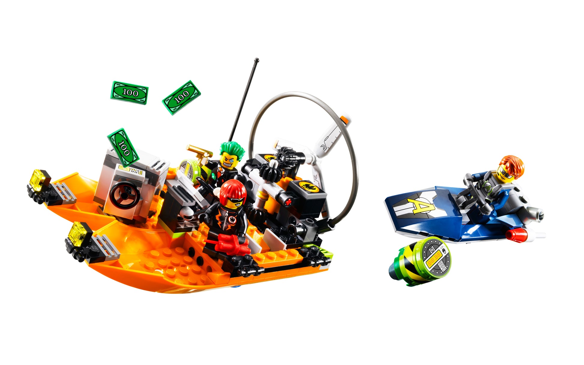 Attention, Agent Fuse! Dr. Inferno's henchmen Dollar Bill and Dyna-Mite have just robbed the City bank and are getting away with their ill-gotten loot aboard their Super Airboat. Your Mission: to recapture the safe using your Agent Waterjet with firing flick missiles -- but watch out for the airboat's explosive devices! 3 minifigures included: Agent Fuse, Dollar Bill and Dyna-Mite! Agent Waterjet is equipped with 2 flick fire missiles! Super Airboat propeller spins when the boat moves! Super Airboat measures 6 inches (15.2cm) long by 4 inches (10.2cm) wide!