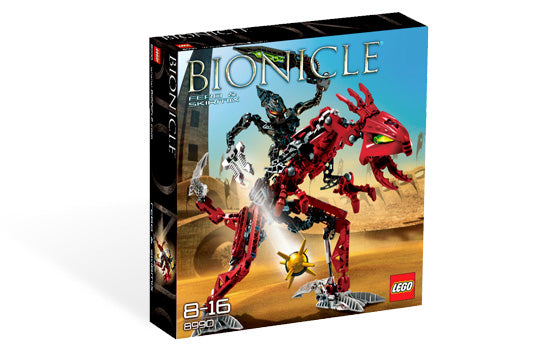 The fierce hunter Fero rides across the desert sands on his rock steed Skirmix, searching for Glatorian to capture and bring back to the arena in Roxtus. Anyone who manages to avoid Fero's spiked Thornax launcher must deal with Skirmix's savage jaws and stinger tail! Includes one Life Counter for the new BIONICLE battle game. Both figures feature fully articulated limbs! Includes life counter for action figure game! Skirmix measures over 10 inches (25cm) tall!